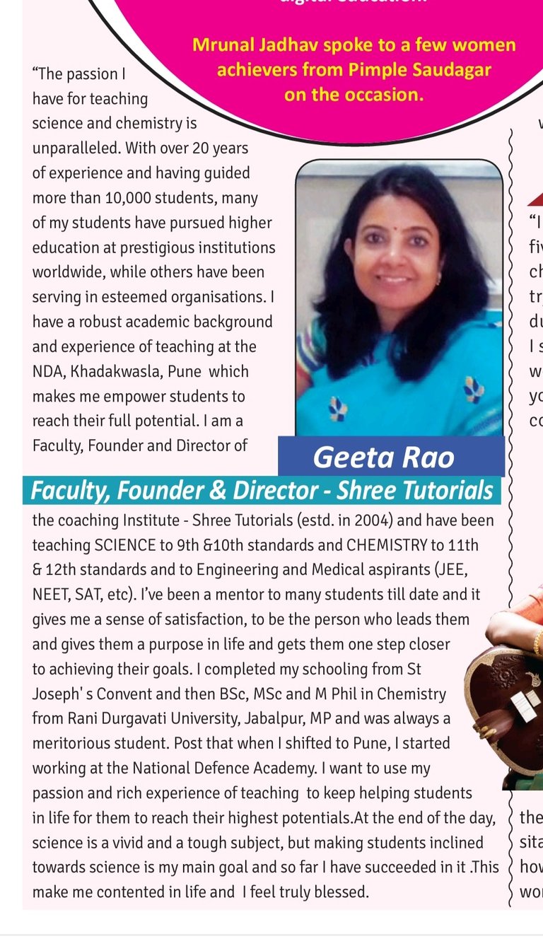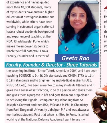 Shree Tutorials β Geeta Rao is a renowned coaching institute founded by Geeta Rao, a passionate educator dedicated to shaping young minds with clarity, discipline, and inspiration.