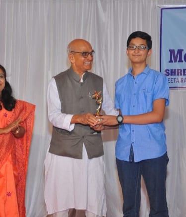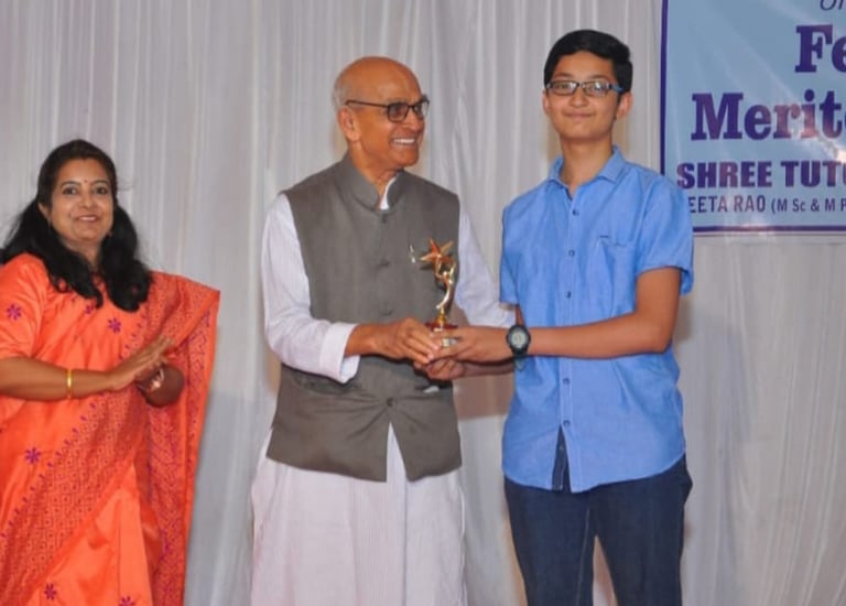 Ansh Gupta achieved 100/100 in Science, felicitated by the Eminent Scientist a key contributor to the satellite ARYABHATTA Dr PJ Lavakare, along with his Science teacher and mentor Geeta Rao